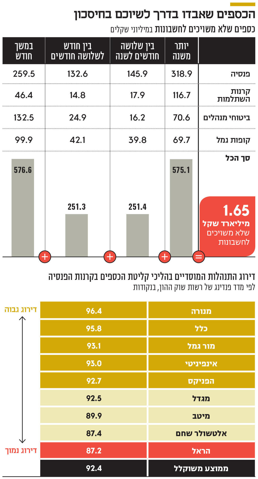 לגבי הכספים שלא משויכים מעל לחודש — מדובר בשירות רע של חברות הביטוח ובתי ההשקעות, שלא עומדים בקצב הפקדות הכספים. על פי מדד הפנדינג של רשות שוק ההון — מדד הבוחן את התנהלותם השוטפת של הגופים המוסדיים בהליכי קליטת הכספים ומעניק ניקוד לכל גוף מוסדי בהתאם לפרמטרים הכלולים במדד — קרנות הפנסיה עם הציון הנמוך ביותר הן של הראל ושל אלטשולר שחם.