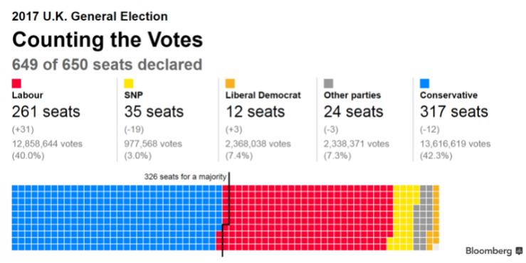 May opted for a snap election to boost her parliamentary majority and strengthen her hand in the Brexit talks due to begin in just 10 days. Instead, her Conservatives were on course to win 318 seats, down from the 330 she held at the start of the campaign and short of the 326 seats she needs for an overall majority. Labour will take 261 seats, a gain of 29 seats, according to BBC projections with just one seat left to declare.