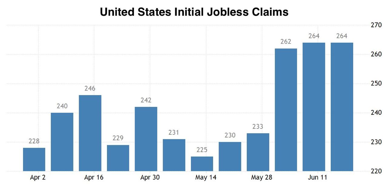 Data from the Bureau of Labor Statistics on Thursday showed 264,000 new claims were filed for jobless benefits on a seasonally adjusted basis in the week ended June 17, unchanged from the prior week's upwardly revised level – the highest level of initial claims activity since October 2021.