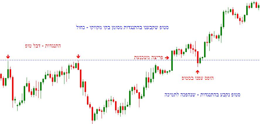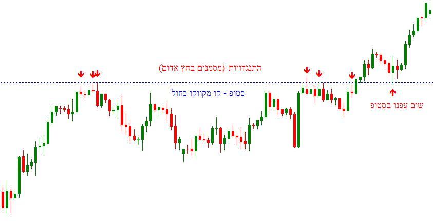 1) לעולם לא נקח את ההתנגדות כמס' קשיח שבלתי ניתנת להזזה, אלא נקח מרווח בטחון ונשתמש עם סטופ יותר נמוך מההתנגדות, אז נכון שיהיו כמה פעמים שנפסיד טיפה יותר כגלל המרווח שלקחנו, אבל לרוב זה יציל אותנו מלהלכד בסטופ (מה שקוראים לזה "ניעור", או אם תרצו "הגדולים אוכלים לנו את הסטופים").