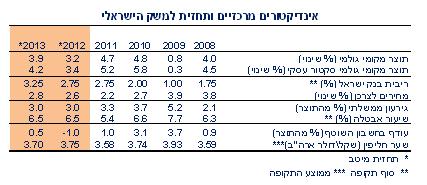 בבנק ישראל עידכנו השבוע, כלפי מעלה, את תחזיות הצמיחה לשנת 2012. כעת, צופים בבנק ישראל כי הצמיחה תעמוד על 3.1%, תוספת של 0.3%, בהשוואה לתחזית הקודמת (בשלהי שנת 2011). אינדיקטורים מאקרו-כלכליים חיוביים יחסית ביחס לפעילות בישראל אשר התפרסמו בתקופה האחרונה, לדוגמא, יבוא סחורות, סקרי ציפיות,