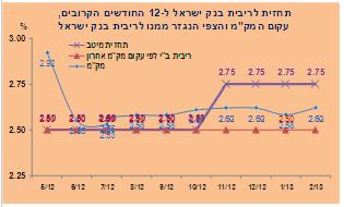 עם זאת, הנתונים האחרונים שהתפרסמו בעולם, בנוסף לשיעור האבטלה שנמצא בשפל היסטורי, מצביעים על כך שריבית בנק ישראל צריכה להיוותר ללא שינוי בחודשים הקרובים. יתר על כן, הואיל ואנו צופים כי הריבית תחזור לתוואי של עלייה עד סוף השנה, בהתאם להתגברות הפעילות הכלכלית לתוך שנת 2013.