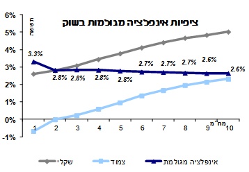 ציפיות אינפלציה נעות בתקופה האחרונה סביב הגבול העליון של יעד האינפלציה של בנק ישראל לטווח של 12 חודשים בין 2.6%-2.8% (הפרש בין אינטרפולציות של תשואות אג"ח שקליות וצמודות). עם זאת, חשוב לציין כי אינטרפולציה שכזאת מעוותת כיום כלפי מעלה בצורה משמעותית בשל אג"ח צמודה 0613 שכוללת גילום שני מדדי אפריל, אשר באופן עונתי גבוהים מממוצע האינפלציה החודשי. מכאן שהציפיות האמיתיות בשוק נמוכות בכמה עשיריות האחוז מהמגולם. לטווחים הארוכים יותר ציפיות שוק האג"ח אמינות יותר ונעות בין 2.6%-2.8%.