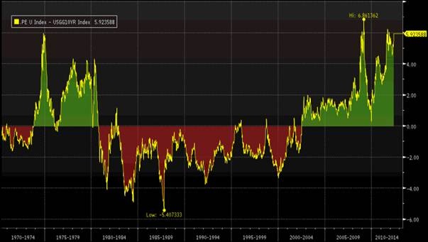 "פרמיית הסיכון" בארה"ב – הפער בין התשואה הצפויה הגלומה במדד ה-S&P 500 לתשואה על אג"ח ל-10 שנים