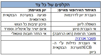עולות. ה-10 שנים האיטלקיות טיפסו בחודשיים האחרונים מ-4.8% ל-5.8% ובספרד מ-4.9% ל-6.3%. בנוסף, למרות הלחץ של האיחוד, סקרים מראים שככל שהלחץ על יוון עולה דווקא כוחן של מפלגות השמאל, המתנגדות לצנע המורחב, מתחזק. כלומר, האיומים של האיחוד רק מחזקים את כוחה של יוון. גם ההתדרדרות של השירותים הציבוריים ביוון לא דוחפת את היוונים ליותר צנע וככל שהזמן עובר נראה שעמדתה מול האיחוד מתחזקת. אם יוון אכן תיקח את המערכה הנוכחית, החשש מקריסתן של איטליה וספרד עלול להתחלף בחשש שגם הן יבינו שיש להן כוח בידיים ויש להן במה לאיים. מה שיהפוך את המערכה הבאה למלחיצה במיוחד. מהלומות האיומים קשות מאד למשקיעים, גם אם אין לאף אחד כוונה לממש אותם.