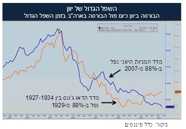 ראו את התרשים המצורף המציג את ההתרסקות של הבורסה באתונה מהשיא ב-2007 ועד היום (ירידה של 88%) אל מול הקריסה של מדד הדאו ג'ונס בארה"ב שנות השפל הגדול ב-1927 (ירידה של 88%). אז (שנות ה-30), הגיע הדאו ג'ונס לשפל לאחר כשלוש שנים. ביוון עברו כבר ארבע וחצי שנים. המדינה לא מצליחה לעבור את