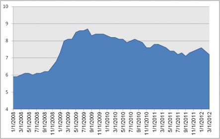 מאז ששיעור האבטלה חצה את רף ה- 8.5% בשנת 2009, חל קיטון מתמשך בשיעורו, ולמרות שבסוף שנת 2011 שיעור האבטלה גדל בחזרה לרמה של 7.6%, המגמה השתנתה וכעת עומד שיעורה על 7.3%. נתון זה הינו גבוה רק ב- 0.2 נקודות האחוז משיעור האבטלה הנמוך ביותר מתחילת המשבר הכלכלי של 2008.