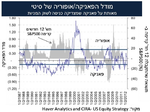 מודל הפאניקה/אופוריה של סיטי הצליח בעבר לחזות במתאם גבוה כדאיות כניסה או יציאה משוק המניות האמריקאי. להמחשה, בחודש אוקטובר האחרון, לאחר הנפילות החדות של אוג' וספט' (כ-20%) הוא ניבא סיכוי 98 אחוז לתשואה דו ספרתית וצדק. מחודש אוק' ועד היום זינק ה-S&P 500 בכ-30%, לפני הנפילה האחרונה. בדו"ח שפרסם אתמול הכלכלן הראשי של סיטי, טוביאס לבקוביץ, הוא ציין: "הסנטימנט השתנה במהירות בחודש מרץ משאננות לפאניקה בכל הקריאות האחרונות של המודל". המודל אומנם לא צורח עדיין "קנה", אבל כבר מאותת על פאניקה שהצדיקה בעבר כניסה למניות למשקיעים בעלי מח"מ של שנה.