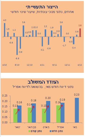 (1) מדד הייצור התעשייתי, עלה ב-2.6%, (נתונים מנוכי עונתיות) לאחר שבחודש הקודם (מארס) התרחב נתון זה ב-0.6%. עלייה נאה זו בייצור, מחקה את ההתכווצות שנרשמה בתחילת השנה, כך ששיעור העלייה בייצור התעשייתי הינו 0.2% מתחילת שנה.