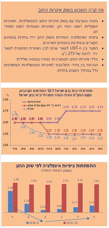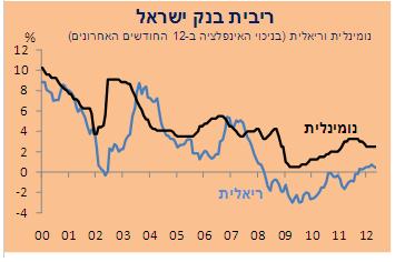 (1) התשואה לפדיון על איגרת שקלית לשנה ושנתיים הינה 2.20% ו-2.33% בהתאמה. כלומר, מחירי האיגרות בשוק כבר מגלמות הפחתת ריבית. זאת, כאשר לאור השיפור באינדיקטורים המקומיים, אנו מאמינים כי הריבית תיוותר על כנה, ואף תעלה במהלך המחצית הראשונה של 2013.