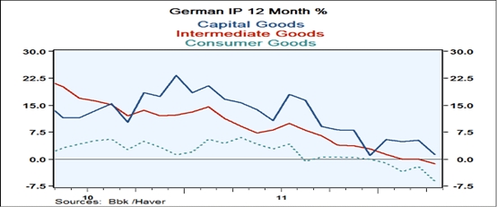 קיים חוט מקשר ברור למדי בין תגובת השוק לתוכנית החילוץ של הבנקים הספרדיים, לבין תגובתו לתוצאות הבחירות ביוון. בשני המקרים השוק הגיב בעליית תשואות, מה שממחיש לדעתנו את הנחיצות לשינוי אופי הפעולה הנדרשת לחילוץ הכלכלה האירופאית מהמשבר הנוכחי. זכייה של "הטובים" ביוון הצליחה לכל היותר להסיר מסדר היום המיידי את החשש מפני תחילת הסערה בשווקי העולם. אלא שגם ניצחונם של המצדדים במדיניות הכלכלית הנוכחית ביוון עדיין אינו פותר את הבעיות העמוקות שבה שרוי גוש האירו. התכנסות נציגי ה 20 G במקסיקו השבוע הניבה כצפוי אמירות נדושות בדבר המחויבות של כל המדינות ל"עשות כל שנדרש" על מנת לפתור את המשבר, אולם שום צעד קונקרטי לא הוצג. מה עוד צריך לקרות על מנת שיינקטו סוף סוף צעדים נחושים כדי לטפל במשבר ? נפילה של בנק גדול ? קריסה של לווה ענק ? לא ברור. "תחושת השאנטי" שמלווה את תהליך קבלת ההחלטות בכל מה שקשור לאירופה מטרידה ביותר. הישיבה הבאה נקבעה ל28 ביוני. מה בוער ? כפי שכתבנו בשבוע שעבר, האדישות של מנהיגי אירופה (והעולם) מקרבת אותנו לנקודת הכרעה. וכמיטב הקלישאה, ככל שההחלטות תדחנה, כך ידרשו צעדים יותר דרסטיים. יתרה מכך, השתהות בנקיטת פעולה עלולה להכניס למעגל המדינות הבעייתיות גם את אלו שנחשבות עד עתה כיציבות כמו : צרפת, בלגיה, הולנד ו...גרמניה. כן, גרמניה. עם כל ההערכה לכלכלה הגרמנית, גם אצלה מתחילים להופיע סימנים המעידים על כך שהמשבר משפיע עליה, כמו לדוגמה הייצור התעשייתי שמוצג למטה ונמצא במגמה ברורה של ירידה בשנה האחרונה.
