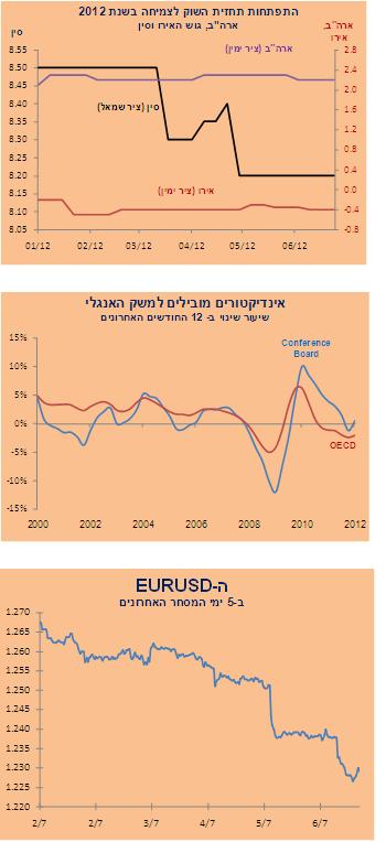 על רקע ההתפתחויות הכלכליות החלשות בתקופה האחרונה כלכלני ה-IMF עדכנו השבוע את תחזית הצמיחה למשק האמריקאי לשנת 2012, כלפי מטה. אמנם, השינוי הוא קל, מ-2.1% (תחזית אפריל) לכדי 2.0%. אך, כאשר לוקחים בחשבון את התמתנות הצמיחה הכלכלית בסין ואת הקשיים הגדלים באירופה, אין ספק כי אנו נמצאים בעיצומו של גל הפחתות של תחזיות הצמיחה למדינות השונות בעולם לשנת 2012. גל זה, גם אם הוא לא קיצוני מבחינת העדכון, החל במאי וצפוי להמשך החודש. סנוניות ראשונות כבר ראינו במדינות כגון ישראל, ואפילו ברזיל אשר לפי סקר כלכלנים, הכלכלה השישית בגודלה בעולם, צפויה לצמוח השנה