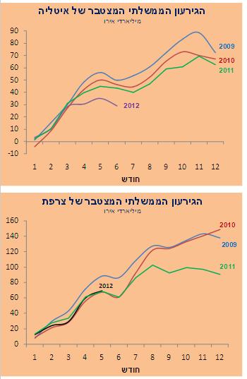 ברבע הראשון של 2012 הגיע הגירעון הממשלתי האיטלקי לרמה של כ-29 מיליארד אירו שהוא כ-8% מהתוצר (במונחים שנתיים). רמה זו גבוהה לכל הדעות, במיוחד על רקע העובדה כי הכלכלה האיטלקית מתכווצת.יתר על כן, היא מזכירה את הפתיחה של השנים הקודמות. עם זאת, הואיל והמיסים מתחילים להתקבל בחודשים אפריל עד יוני, הגירעון ברבע השני של השנה היה אפסי (אף נרשם עודף ביוני).