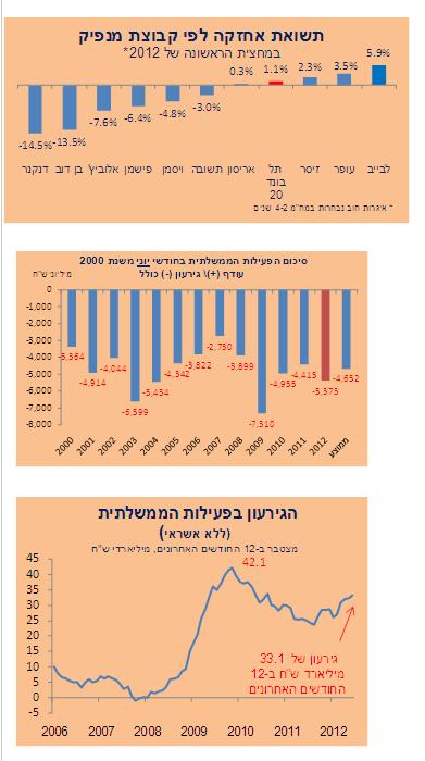 ב- 12 חודשים האחרונים הסתכם הגרעון בכ-33.1 מיליארד שקלים שמהווים כ-3.7% מהתוצר המקומי גולמי אם נשמיט את ההכנסות