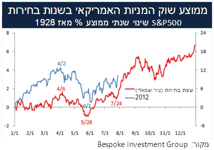 2012 היא שנת בחירות בארה"ב ולאמריקאים יש משהו עם בחירות ומניות. הם נוטים להאמין שלממשלות מכהנות יש אינטרס גדול להגיע לבחירות כששוק המניות לאחר עליות ולכן פועלות באותה שנה במדיניות המטיבה עם שוק ההון. בדיקה היסטורית של שוק המניות האמריקאי בשנות בחירות (מאז 1928) אכן מראה סיכוי גבוה מאד לעליות (ראו גרף). אך מעניין לא פחות הוא הדפוס של אותן עליות. מדד המניות S&P500 התחיל שנת בחירות ממוצעת במגמה יציבה עד חיובית שהגיעה לשיאה בתחילת חודש אפריל, משם החל המדד בנסיגה קצרה עד לסוף חודש מאי שלאחריו על גל עונת הדו"חות הכספיים לרבעון השני, חזר לעליות ממושכות עד לתחילת חודש ספטמבר. מספטמבר השוק נרגע וירד, אך שוב לזמן קצר שהסתיים בסוף חודש אוקטובר כשלאחריו יצא המדד לראלי של סוף שנה. המעניין הוא שדפוס התנהגות שוק המניות בחצי השנה הראשונה של 2012 נראה דומה מאד לאותו דפוס היסטורי. מי אנחנו שנבאס ונגיד שזה אולי סתם צירוף מקרים אקראי...