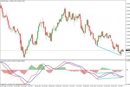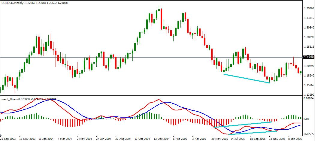 בפעם האחרונה שראינו סטיה חיובית, היתה בנובמבר 2005 (גם ב MACD וגם בהיסטוגרמה (מסומן בתכלת)), כשהיורו הגיע אל מול הדולר לשפל ב 1.1640 ואז עשה אחורה פנה, ופיתח מגמת עליה והגיע לשיא כל הזמנים ל-1.6038.