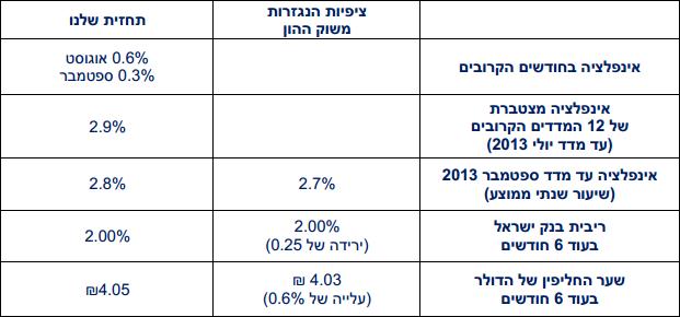התחזית שלנו למדדים הבאים: 0.6 אחוז באוגוסט, 0.3 אחוז בספטמבר, 0.3 אחוז באוקטובר וב-12 החודשים הבאים 2.9 אחוזים. התחזית לוקחת בחשבון את העלייה האחרונה במחירי המזון האנרגיה, כולל את העלאת המע"מ בספטמבר ואת הפיחות שחל בחודש האחרון בשקל.