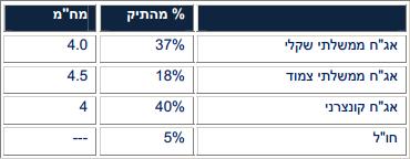 3. אג"ח קונצרני מקומי – מומלץ לא להגדיל סיכונים. בתל בונד 20 הפער מעל אג"ח ממשלתי שוב גדל בשבוע האחרון ל-%3.4, כאשר הבנקים מושכים לצד אחד (למטה) בעוד שכל מה שאינו בנקים מושך לצד השני (למעלה). על השונות הגדולה ניתן ללמוד מהמדדים החדשים בבורסה: בשלושת החודשים האחרונים מדד תל בונד בנקים עלה ב-%2.5, בעוד שמדד תל בונד צמודות יתר ירד ב-%0.4. במונחים שנתיים מדובר על פער של כמעט %12 - פער בלתי נתפס אשר מצביע על נכונות המשקיעים לקבל תשואה נמוכה (יחסית לאג"ח קונצרני), אך בטוחה (יחסית).