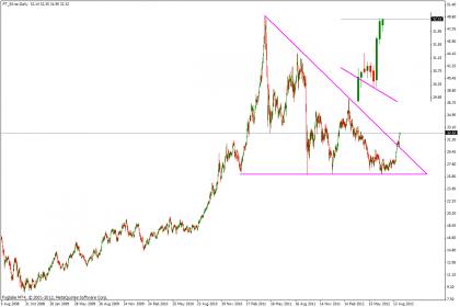 גם הכסף כמו מקבילו הזהב שרטט לנו משולש יפה, כשהתחתית נקבעה לפני שנה ושלושתרעבי בערך (28 בינואר 2011) באיזור 26 דולר לאונקיה (תמיכה מרובעת), כשלפני שבועיים נפרצה, ושבוע שעבר נבדקה...