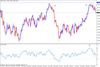 אם תסתכל על התמונה הכללית (גרף יומי), תוכל לשים לב שבסה"כ מדובר בהמשך הסנטימנט הכללי, שהחלה כשהגענו לאיזור 1.63 (תמונה 1 מסומן בחיצים) ולקניות יתר אגרסיבית (מעל 80 ב-RSI (תמונה 1 מסומן בחץ))