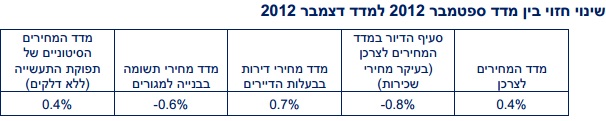 יחסית של 0.6 אחוז. לאחרונה חלה עלייה מחודשת במחירי הדירות כאשר ב-6 החודשים האחרונים נרשמה עליה של 2.9 אחוזים. דבר אשר על פי הפרוטוקולים של דיוני הוועדה המוניטרית מטריד גם את בנק ישראל. יחד עם זאת, במבט על תקופה ארוכה יותר ב-12 החודשים האחרונים עליית מחירי הדירות מסתכמת ב-1.4 אחוז, בלבד.