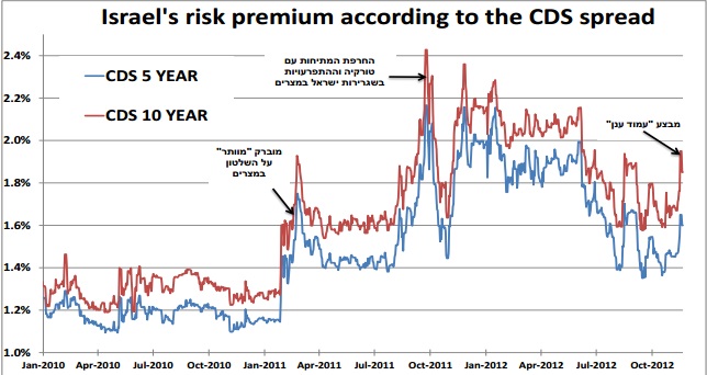 על רקע המצב הביטחוני בשבוע האחרון השקל נחלש וחלה עלייה בפרמיית הסיכון של ישראל.