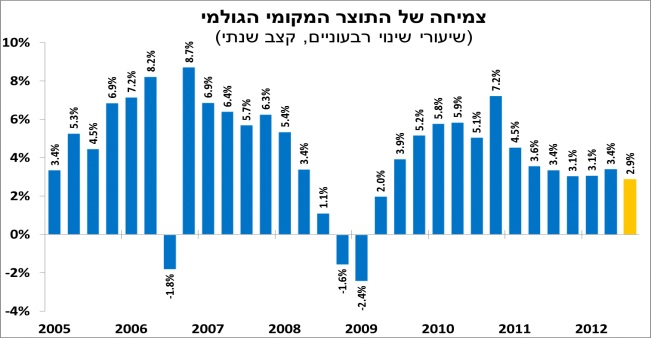 נתוני החשבונאות הלאומית של ישראל לרבעון השלישי השנה, מלמדים על המשך התמתנות צמיחת התוצר; ברבעון השלישי נרשמה צמיחה של כ-2.9 אחוזים, הנמוכה מהצמיחה ברבעון השני (3.4 אחוזים) ומהרבעון הראשון השנה (3.1 אחוזים).