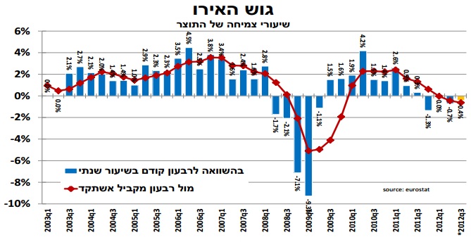 התוצר בגוש האירו התכווץ ב-0.4 אחוז ברבעון השלישי של 2012 (במונחים שנתיים- על פי האומדן הראשוני).