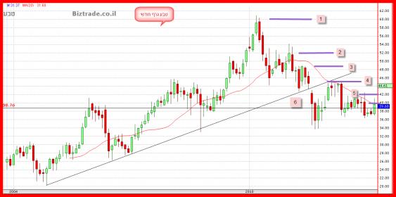 מאז הגעה לשיא במחיר 63$, המנייה לא מצליחה אפילו להתייצב ברמו סבירות או קרובות לו , והגרף מציג בכול פעם שיאים יורדים ! כאשר המשפט הטכני הזה מופיע בגרף מנייה " שיאים יורדים ", זה פשוט אומר שיש למחיר בעייה רצינית להתעושש, ואינו מסוגל לחזור למחירים אפילו קודמים ושלא נדבר על שיאים חדשים ! המדרגות היורדות, או לחילופין כניסה חוזרת של המוכרים , מופיעות בגרף בקו סגול, כאשר בשום חודש כול שהוא המחיר לא סגר מעל ה60$ ( 1 )ונדחה משם מיידית ! לאחר 11 חודשים המוכרים כבר לא המתינו לרצינותם של הקונים וירדו מדרגה אל קו ה 52$ ( 2 )ושם לקחו את היוזמה לידייהם שוב ! לאחר שלושה חודשים שוב המוכרים נכנסים לתמונה באופן אגרסיבי ולא ממתינים לקונים כאשר את רף ה 49$ ( 3 )הם חוסמים ! שנה לאחר מכן אותם קונים אשר הצליחו להרים את המחירים משפלים באזור ה 34$ נחסמים מחדש אבל כבר נמוך יותר ב 45$ ( 4 ), והחודשים עוברים ו לאחר 8 חודשים המוכרים מוכנים שוב לפתוח את מרכולתם אבל עכשיו כבר ברמות ה 42$ בלבד (5 ) , (אתם זוכרים! המדרגות החלו לרדת מ60 $ ), ולמרות התייצבות באזור ה 37$ ויצירת תחתית כפולה ברורה, הנר החודשי הנוכחי נחסם ב 40$ ( 6 )שזו ירידה ריאלית במחיר המנייה של כ 33%, שבכדי שהמנייה תחזור למחירי שיא ב 60$ היא זקוקה לעליות של 50% !!!! במחירה הנוכחי . יחד עם זאת , מהרגע שהמחיר שבר קו מגמה עולה , אזי הוא גם נסחר תחתיו , עם ההתנגדות שבו. והוא זה אשר עזר לחסום את אזור ה4 בקו ה 45$.