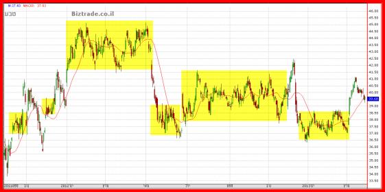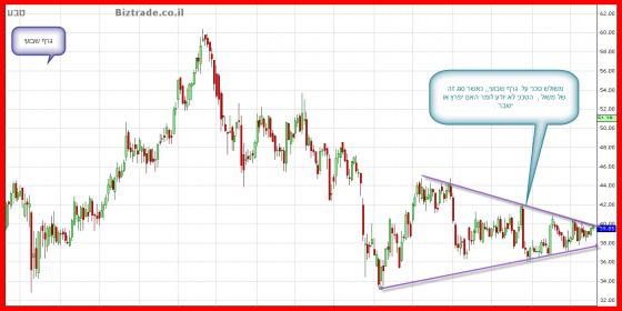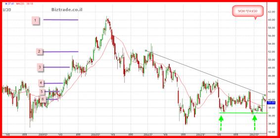 גם בגרף זה ניתן לראות בבירור את ירידת המדרגות במשך כ 3 שנים כאשר הם ,המוכרים ,לא ממתינים לטובות מצד הקונים, ולמעשה לוחצים על ירידת מחירים ! המינוס הגדול של הגרף , באופן טכני כמובן הוא ש רמות המחירים לא מצליחים להציג שפלים עולים, ובכך כול פעם מחדש מקבלים הקונים לחץ מלמעלה , ולמעשה ההישג היחידי של הקונים בתקופה האחרונה הוא התחתית הכפולה שנמצאת ב אזור ה 36.5$ ( מסומן בגרף בקו וחצים ירוקים ), אבל פרט להישג הטכני הזה, ידם של המוכרים על העליונה בכול שלושת השנים האחרונות.