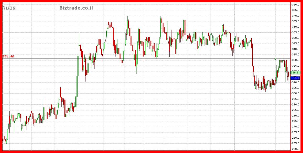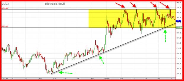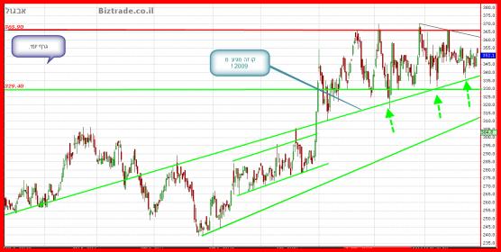 מצב הדשדוש במחיר מאוד ברור , כול הגעה מטה מכניסה קונים, וכול הגעה מעלה מכניסה מוכרים, על כן רק פריצה של ה 366 או שבירה של ה 330 יתנו בגרף זה את הכיוון עם צפי לתנועה מהירה של כ 35 אגורות לכול כיוון שלא יהיה.כרגע נמצא המחיר בסבב מטה שלו ולמעשה מתקרב ל קו המגמה העולה המסומן בגרף, אבל המצב המענין הוא ששבירת קו המגמה היורד בתוך טווח הדשדוש יכול להכניס עוצמה לירידות עם סיכוי שבירת הטווח התחתון של הדשדוש.