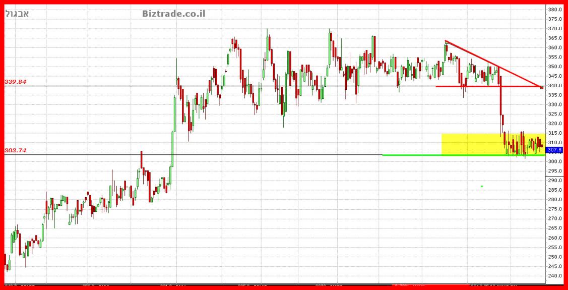 מאז העדכון הארון לפני קרוב לחודשיים הספיק הגרף לשבור משולש טכני מטה , (מסומן בקווים אדומים ) עם ירידה של קרוב ל 15%, כאשר הוא יושב על קו התמיכה ב 300 מעל חודש.(קו אופקי ירוק )