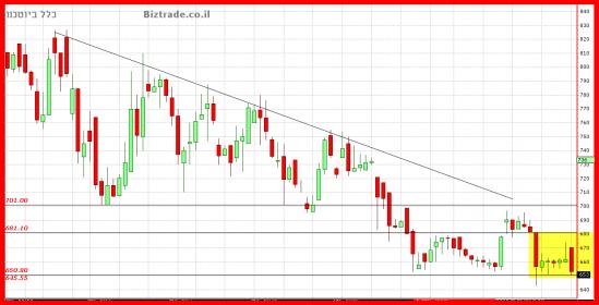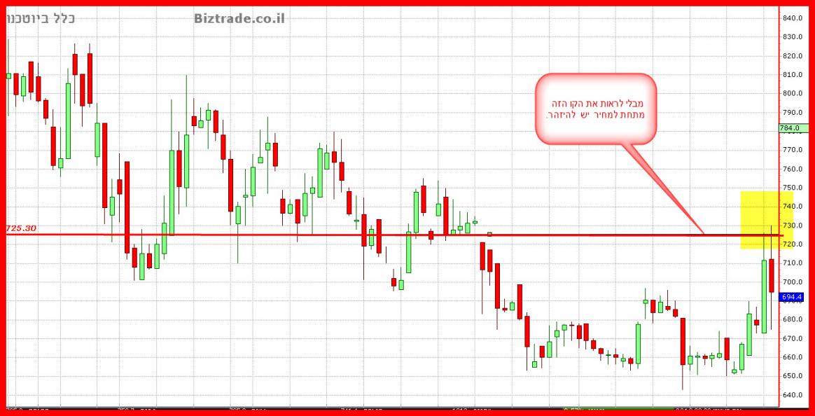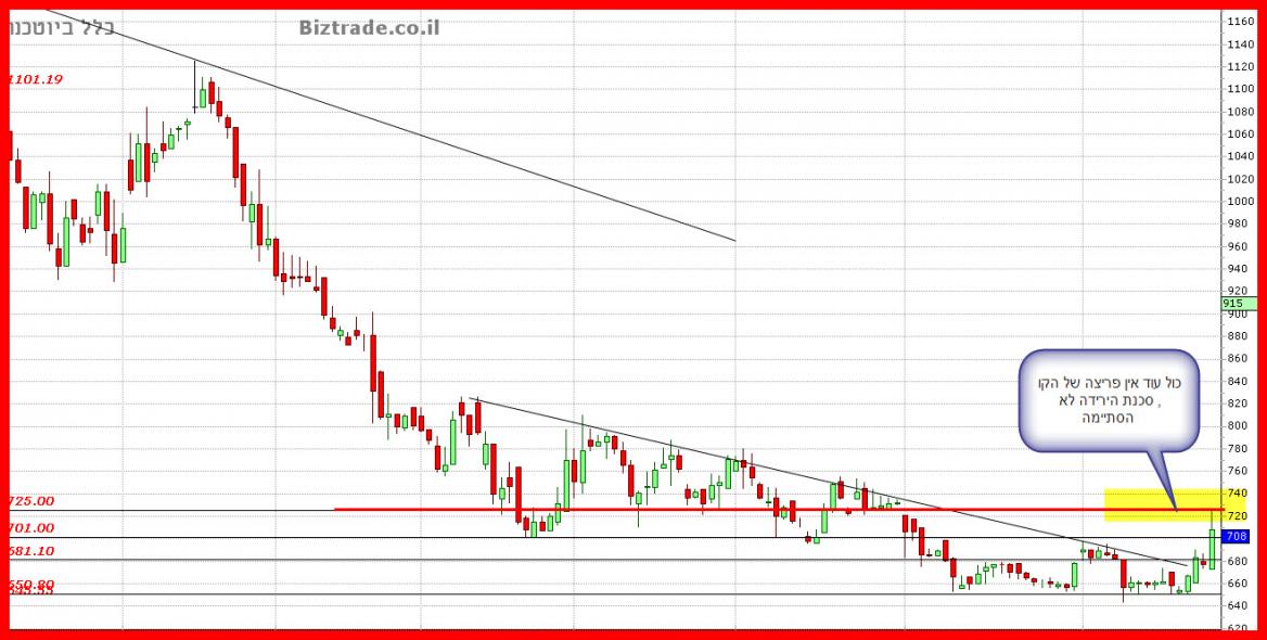 לסיכום : יותר צרות טכניות בגרף כלל ביו היא לא יכלה לבקש, יש לה בשפע ! אבל טכנית זה לא אומר שהתיקונים העולים לא צריכים להגיע, התרוממות עם סגירה ב 726, נותן לה יעד לאזורים ב 750, ולקו מגמה יורד מינורי, כאשר כול קו שתעבור מעליו צפוי יהיה לשמש כתמיכה, כאשר קווים ב 800 -- 850 -- הם