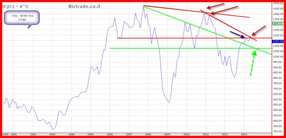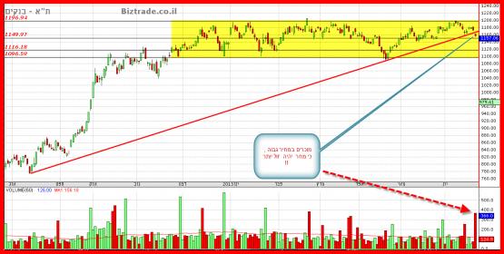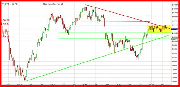 מגזר הבנקים בדשדוש ברור, במשך 29 שבועות = 145 ימי מסחר !!! איפה הקופות !! איפה המוסדיים !!! היתכן שהם מוכרים בגבוה כול התקופה הזו כי בהמשך יהיה זול יותר , או שבדשדוש הארוך הזה , הם קונים בנמוך כי מחר יהיה יקר יותר, כול אחד מ ה קוראים רשאי לקחת עמדה, אני לוקח לעצמי על פי המתנדים בגרף , שזה אומר , היום המחיר הוא טוב כי מחר יהיה זול יותר, מתנדים חודשיים + שבועיים בקניות יתר, זה לא מצב בריא, זה לא מצב שמאפשר פריצות חשובות כמו ה 1200, זה לא מצב שממנו עולים אלה רק יורדים, היום , מחר או חודש הבא !!