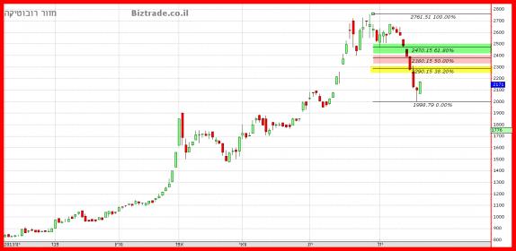 הגרף היומי של המנייה מאוד רוצה לתקן מעלה ומהר, , וכול ה התמיכות וההתנגדויות מופיעים בגרף בטווחים שבין 1900 -- 2760 , כאשר ההתנגדויות הקרובות כרגע למחיר הם , 2200----230 --- 2400 ---2450 כקו מגמה עולה אשר נשבר בירידות האחרונות.