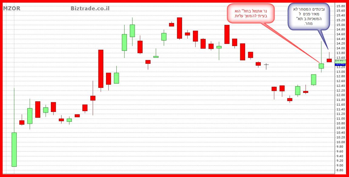 מחיר המנייה נבלם , ונעצר בקו ה 2700 , כאשר הגבוה השנתי בינתיים היה ב 2760 , כאשר המחיר נשאר תקוע בין רמת 2500 ל 2700 במשך 14 ימי מסחר,ושבירת ה 2500 מטה היה האות פתיחה למהלך יורד מתקן על כול העליות היפות של המחיר מאז ינואר השנה, המחיר נתמך יפה בקו ה2000, שהוא קו תמיכה טכני ו פסיכולוגי . הגרף יוצר תבנית היפוך מעלה בנרות היפנים בגרף בשם פטיש, כאשר נר האישור כבר הופיע ביום המסחר האחרון: