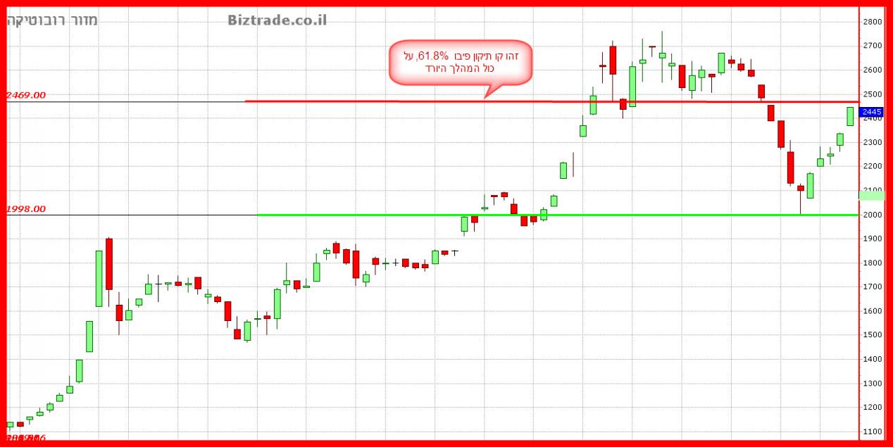 מוקדם לומר האם מזור תחזור למחירי השיא שלה, כי התיקון העולה רק בצעד הראשון שלו, ושנית, גרף שבועי של המנייה מאוד רוצה המשך ירידות על כן צירפתי גרף נוסף עם חישובי פיבונצי בכדי שנעקוב ונדע האם זהוא רק תיקון טכני עולה או חזרה לשיאים, כאשר פריצת ה 61.8% פיבו יומר במפורש שמזור תחזור לשיא הקודם, לאחר שהתמודדה עם כול ההתנגדויות בדרך.
