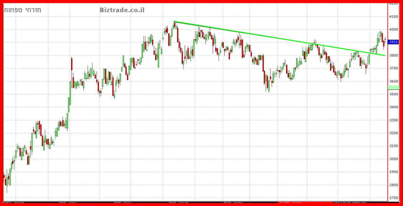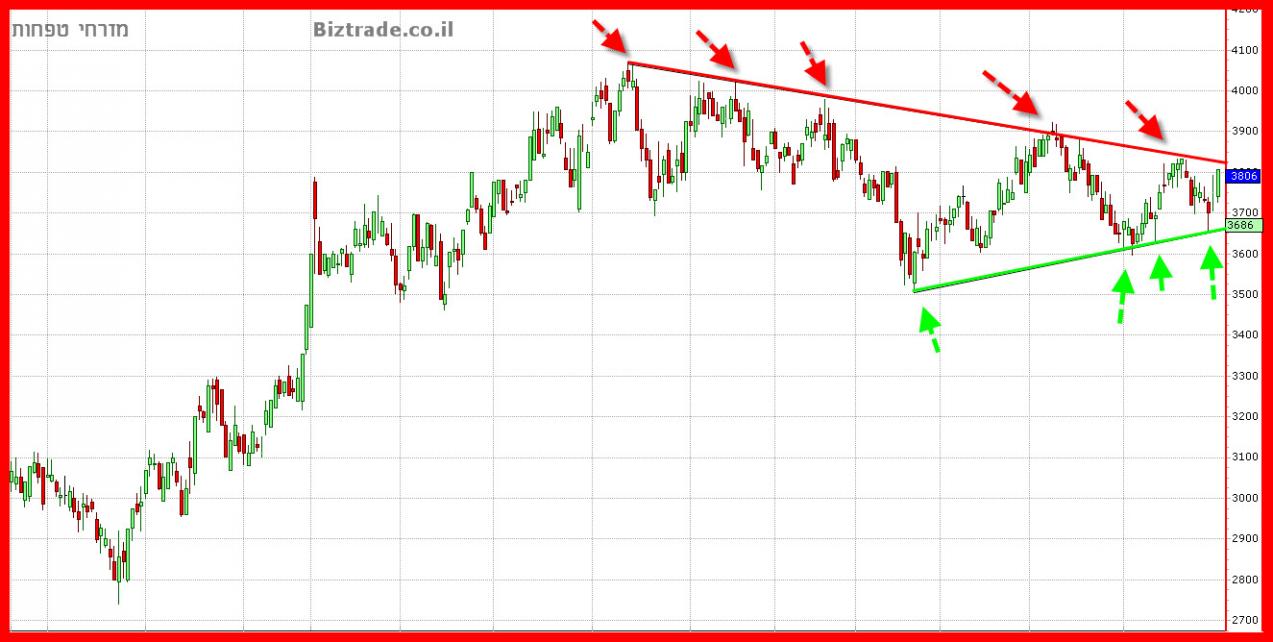 את ההתנגדות האופקית אשר ב 3800 המחיר כבר פרץ היום, ובכך הוא קרוב מאוד לצלע העליונה של המשולש, שנמצאת כרגע על קו ה 3822.