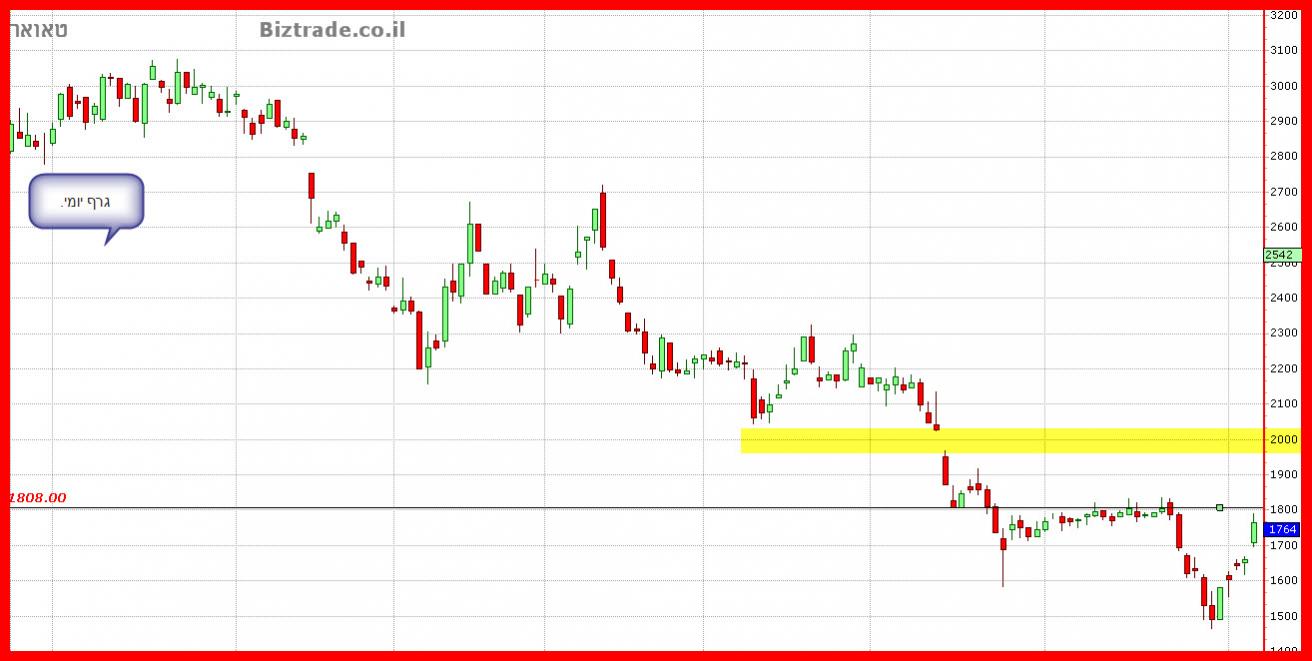 אשר שוב ירדה לרמות שלא חשבה בעצמה, מתרוממת עם קונים החל מ שער 1500, ובו נוצר תבנית היפוך בנרות היפנים בשם בולען שורי,, מאז ההיפוך אנו נמצאים ביום המסחר הרביעי, והיום המחיר עולה מעל 6%, כאשר הוא פורץ את קו ה 1700. כול מתנדי הגרף מומנטום ומגמה, בעד המשך עליות כאשר במידה וקו ה 1800 ייפרץ , זה יוכל לשלוח את המחיר לאזור הפער הפתוח אשר מסומן במרקר צהוב על הגרף , ובמידה ו התנגדות ב קו ה 1800 תעמוד בעינה זה יוכל לשלוח חזרה , את המחיר לתחתית כפולה באותו 1500 .