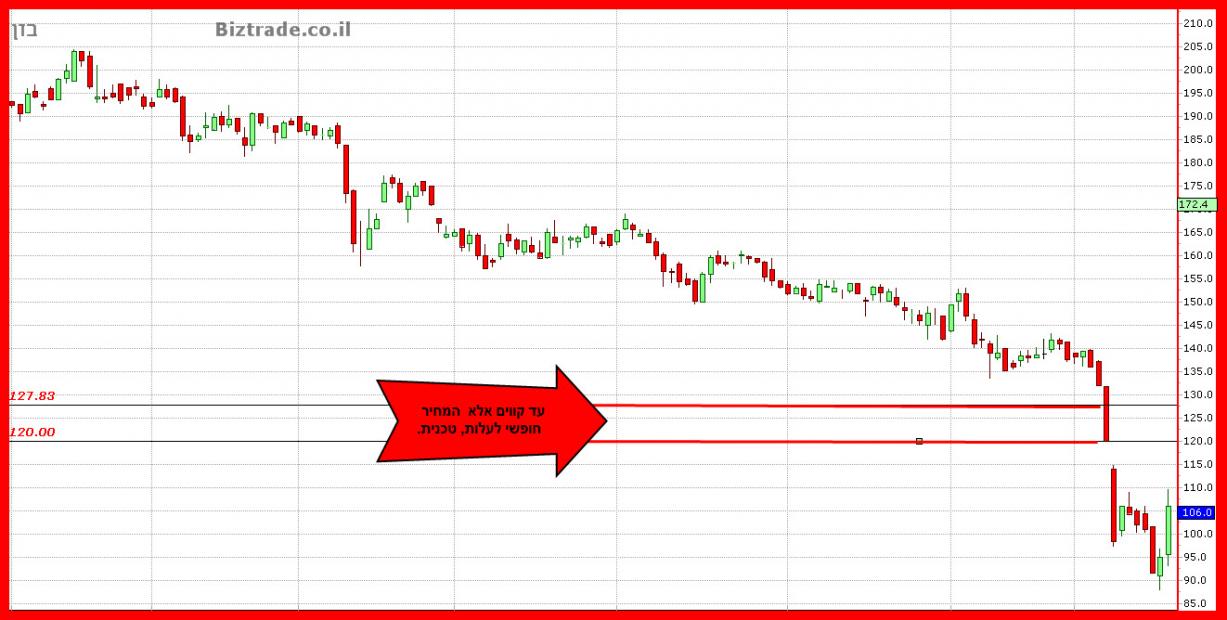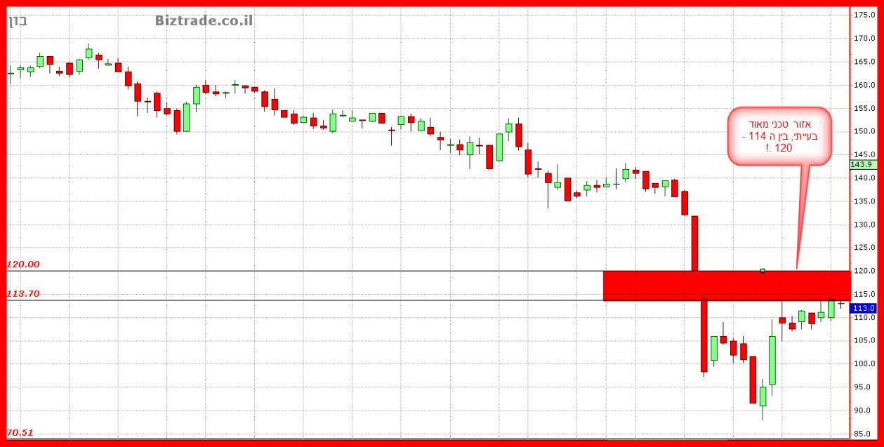 על גרף יומי כמובן התיקון העולה למהלך היורד מתבקש ויוכל להגיע , וגם אם יצא לדרך , הוא לא צפוי לעבור כרגע את ה 120 , שהוא תיקון פיבו 50% על כול המהלך היורד האחרון . ויחד עם זאת התיקון היום היה גם כך , טכנית , מתבקש , עקב הימצאות כול הנר היומי מחוץ לגבולות רצועות בולינגר.