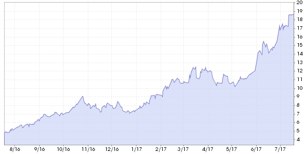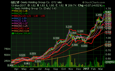 חברת הרכב ג'ילי והבעלים של חברת הרכב השבדית וולוו בגרף הרב שנתי ניכרת המצוקה שלאחר הרכישה. שנה שעברה עוד ניראה שיש צמיחה מספר חודשים אלא שבנובמבר תפנית חדה הורידה את שער המניה לאיזור בו שהתה לפני כ-3 שנים. מתנדי ה-RSI והסטוקסטי בתנועה באיזורי השורט ומתנד ה-MACD בגל יורד ארוך מתחילת 2014. לאחרונה ניצפית יציאת הון מהמניה שתגרום למהלך שורטי מהותי.