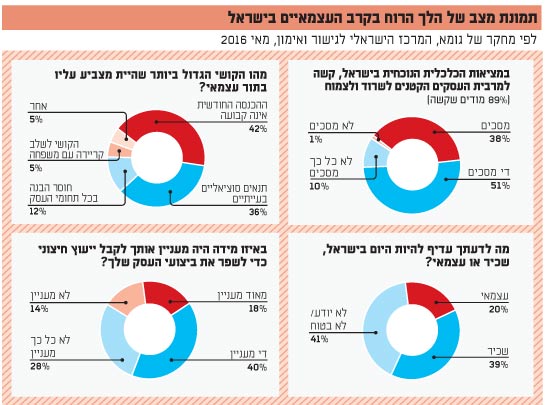 "עסקים קטנים ובינוניים מהווים את רוב המגזר העסקי בישראל. כדי לאפשר התפתחות של כלכלה בריאה מגזר עסקים זה צריך להיות דינמי, יעיל ותחרותי וצריך לאפשר לשלב בפעילות העסקית בו את כל האזרחים במדינה. לשם כך, עסקים צריכים להרוויח ולפעול בצורה מסוימת של ביטחון תוך שימור תחרות בריאה בינם לבין עצמם ובינם לבין העסקים הגדולים".את הפסקה לעיל שלפנו מדוח של משרד הכלכלה והתעשייה על מצב העסקים הקטנים והבינוניים בישראל מינואר השנה. והאמת? כמעט כל מילה נוספת מיותרת, חוץ אולי מכמה מספרים שיאשררו זאת: רוב העסקים במגזר העסקי (בנטרול המגזר הממשלתי) הם עסקים עצמאיים ללא מועסקים ועסקים זעירים עד 5 מועסקים. למעשה, עסקים עם 5 מועסקים ומעלה (קטנים, בינוניים וגדולים) הם רק 14.5% בלבד מהעסקים במשק. אז אם יש לכם תחושה שכולם עובדים בעסקים בינוניים ויותר (ב"גלובס", לדוגמה יש קצת יותר מ-250 איש), התחושה הזאת מוטעית.לכן הלך הרוח של אותם עצמאים ובעלי עסקים קטנים הוא מהותי כדי להבין כיצד המגזר העסקי מרגיש באשר לסביבת העבודה שלו וכיצד הוא תופס את המציאות הכלכלית שלו. ומתברר שהוא לא מרגיש ממש בנוח, לפחות לפי סקר של גומא.הסקר בוצע במאי האחרון בקרב 303 איש, בני 25-65 עצמאים ובעלי עסקים זעירים עד קטנים, והעלה תמונת מצב די בעייתית: 89% מהנשאלים חושבים שבמציאות הכלכלית הנוכחית בישראל קשה לשרוד ולצמוח, וכפועל יוצא - רק 20% מהנשאלים, שברובם עצמאים כאמור, השיבו כי עדיף להיות עצמאי ולאשכיר. כלומר, הרוב הגדול של העצמאים היה מעדיף להיות שכיר או לא בטוח באשר לבחירתו להיות עצמאי, וחוסר ביטחון כזה מעיד יותר מכול על מצבו הבעייתי של המגזר העסקי."לא כולם מוכנים להודות שהם טועים בהחלטתם להיות עצמאים, ומצד שני לא רואים את עצמם חוזרים להיות שכירים. יש מחסום רגשי למי שטעם חיים עצמאיים. לרוב, להיות שכיר מבחינתם זה ללכת אחורה", אומר יהודה אטיאס, מנכ"ל גומא.