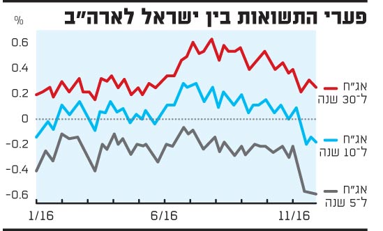 בחירתו של דונלד טראמפ לנשיאות ארה''ב, והמשך הכרזותיו על תוכניות פיסקאליות אדירות מימדים, הביאו לירידות חדות בשערי האג"ח הממשלתיות והקונצרניות בארה"ב ובעולם. הירידות לא פסחו על אג"ח לכל טווחי הזמן, והיו חזקות במיוחד באגרות החוב ארוכות הטווח.עקום התשואות בארה''ב רשם עלייה חדה בתשואות לפדיון לכל אורך העקום. המשקיעים החלו לשנות את תפיסתם והפנימו שייתכן שאנו נמצאים בסופו של עידן "הריבית האפסית" ובמעבר ממדיניות מוניטארית מרחיבה למדיניות פיסקאלית מרחיבה, ובעקבותיה כנראה למדיניות מוניטארית מרסנת יותר בארה''ב.כתוצאה מכך, הפער בין תחזיות הריבית שמגולמות בשוק לבין תחזיות הריבית של הפד לשנים הקרובות, הצטמצם בצורה משמעותית, ומגלם כיום שלוש העלאות עד סוף 2017 והמשך העלאות ריבית בשנים שלאחר מכן.גם הדולר עלה מול סל המטבעות לשיא חדש שלא נראה כדוגמתו מאז 2002.וכיצד הגיב שוק האג"ח המקומי לירידות החדות בשוק האמריקאי?גם בישראל נרשמה עליית תשואות לפדיון, ובעיקר בחלקים הבינוניים והארוכים של העקום, בשל העובדה שהמתאם בין השינוי בתשואות האג"ח הארוכות בארה''ב לבין האג"ח המקבילות בשוק המקומי, גבוה מאוד בהשוואה למדינות רבות.עם זאת, עליית התשואות בישראל הייתה מתונה יותר מאשר בארה"ב. התוצאה הייתה, שפערי התשואות לפדיון בין האג"ח הממשלתיות של ישראל בהשוואה למקבילותיהן האמריקאיות, המשיך להעמיק בטריטוריה השלילית לאורך מרבית העקום. בגרף המצורף, ניתן לראות את פערי התשואה בהם נסחרות אג"ח לטווחים של 5, 10 ו-30 שנה.כך לדוגמה, פער התשואות לפדיון בין אג"ח ממשלתית בישראל לבין מקבילתה בארה''ב לטווח של 5 שנים, עומד כיום על מרווח שלילי של 0.55%-, כאשר רק לפני כחודש פער זה עמד על 0.18%- בלבד. באג"ח ל-10 שנים, הפער הפך לאחרונה לשלילי, של כ-0.2%-, קרי אג''ח ל-10 שנים בישראל נסחר כיום, גם הוא, בתשואה נמוכה יותר מאשר אג''ח ל-10 שנים בארה''ב. זאת, לאחר שבחודשים האחרונים הפער היה חיובי בשיעור דומה.רק בטווחים הארוכים ביותר על העקום, ל-30 שנה, פער התשואות עודנו חיובי, כלומר, התשואות בארה"ב גבוהות במקצת מאלה שבישראל, אם כי גם פער זה נסגר לאיטו.