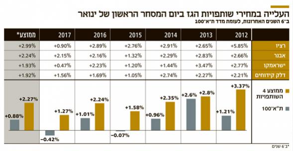 בכל אחת משש השנים האחרונות ביום המסחר הראשון של חודש ינואר עלה מחירן של כל אחת מארבע שותפויות הגז הגדולות שנסחרות בתל אביב עלה ב־2.27% בממוצע, ותרם לעלייה של קרוב ל־0.1% במדד ת"א־100.