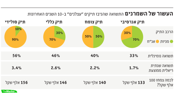 תיק שנחשב ל"נורמלי" והכיל 70% אג"ח ו–30% מניות, השיג תשואה ריאלית של 2.6% לשנה בממוצע (3.8% נומינלית). דווקא תיק שמרני מאוד, שהכיל 90% אג"ח ורק 10% מניות, הניב תשואה ריאלית סבירה יחסית של 3.4% בממוצע (4.6% נומינלית).