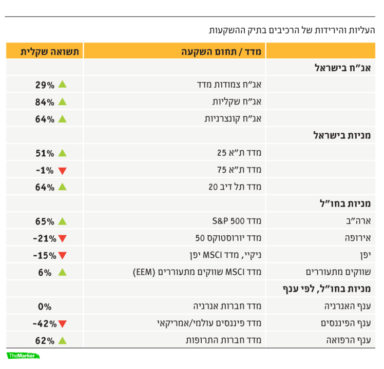 רכיבי התיק שהצגנו לפני 10 שנים כללו בחלק האג"חי רק מדדי אג"ח בישראל — אג"ח צמודות, אג"ח שקליות, ואג"ח קונצרניות בדירוג גבוה (תל בונד 20). אם היינו מרכיבים תיק כזה כיום, היינו מפנים חלק משמעותי גם למדדי אג"ח בחול. בחלק המנייתי חשבנו שנכון יהיה לפזר את ההשקעה באופן שווה בין ישראל לחו"ל.