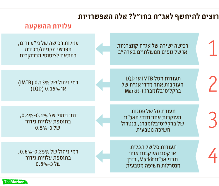 מי שלא מעוניין להרחיק יכול להיחשף למדדי אג"ח בחו"ל גם באמצעות תעודות סל ישראליות. בית ההשקעות פסגות, שהוא הגוף הפעיל ביותר בתחום, מציע עשר תעודות שעוקבות אחר מדדי אג"ח בחו"ל, רובם של בלומברג־ברקליס. שש מתוך עשר תעודות הן מנוטרלות מטבע, כדי להבטיח שההשקעה תישמר כסולידית (כלומר, ללא חשיפה לשוק המט"ח, שהוא תנודתי ולא צפוי). התעודות גובות דמי ניהול נמוכים של 0.1%–0.45%. גם המתחרה תכלית מציעה תעודת סל שעוקבת אחר מדד IBOXX 30 בדמי ניהול של 0.6% (ללא הגנת מטבע); ואילו קסם מציעה שלוש תעודות מנוטרלות מטבע שעוקבות אחר מדדי IBOXX בדמי ניהול של 0.25%–0.6%.