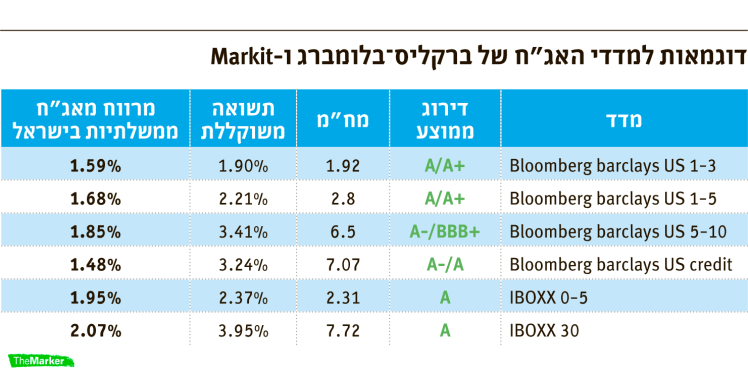 מדד Bloomberg barclays US 5–10 למשל, כולל אג"ח בדירוג ממוצע של +A-/BBB, ובמח"מ של 6.5 שנים. התשואה המשוקללת במדד היא 3.4%, בהשוואה לתשואה של 1.5% באג"ח של ממשלת ישראל במח"מ זהה. מדובר בפער (מרווח) של כ–1.85%. דוגמה אחרת היא מדד IBOXX 30. המדד כולל אג"ח בארה"ב בדירוג A ובמח"מ ממוצע של 7.7 שנים. התשואה המשוקללת במדד היא 3.95%, בהשוואה לתשואה של 1.9% באג"ח של ממשלת ישראל במח"מ זהה. מדובר הפעם בפער של כ–2.1%.