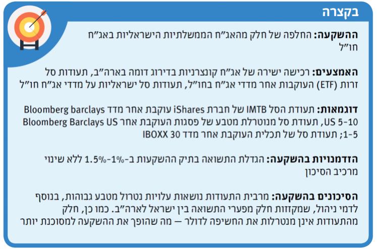 בשורה התחתונה, הסטה של 15%–20% מהנכסים בתיק למדדי האג"ח בארה"ב יכולה להיות אמצעי ראוי לטיוב ולמקסום התשואה בתיק ההשקעות, ללא שינוי מרכיב הסיכון. מנגד, יש להיות ערים לעלויות ההשקעה, כולל המרכיב הסמוי, ולשקלל אותן ביחס לפערי התשואה.