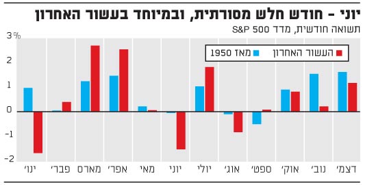 גם ללא האתגרים הפוליטיים, השוק נכנס לעונת שנה קשה, כאשר האדישות של הקיץ מתקרבת. בעשר השנים האחרונות, מדדי המניות רשמו ירידה חציונית של 0.79% בשבועיים שבין 30 במאי ו-13 ביוני, לפי נתוני קבוצת ההשקעות והמחקר Bespoke. משנת 1950, יוני הוא בין החודשים הגרועים למניות בארה"ב. רק לחודשי אוגוסט וספטמבר יש תשואות ממוצעות נמוכות יותר בגרף שהכין ריאן דטריק, אסטרטג השוק הבכיר של חברת LPL Financial.